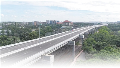 由中国山东高速集团主导投资建设运营的孟加拉国首条高架快速路——达卡机场高架快速路项目(一期)通车仪式9月2日在孟加拉国首都达卡举行。项目通车后极大改善了达卡市区交通状况。图为孟加拉国达卡机场高架快速路项目(一期)远景。