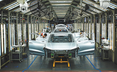 广东省佛山市一汽大众汽车智慧工厂内,新能源汽车生产线开足马力。