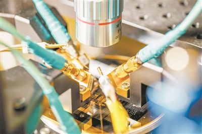 研究人员使用多个微波频率表征在硅晶片上构建的非线性声子混合装置。图片来源:桑迪亚国家实验室